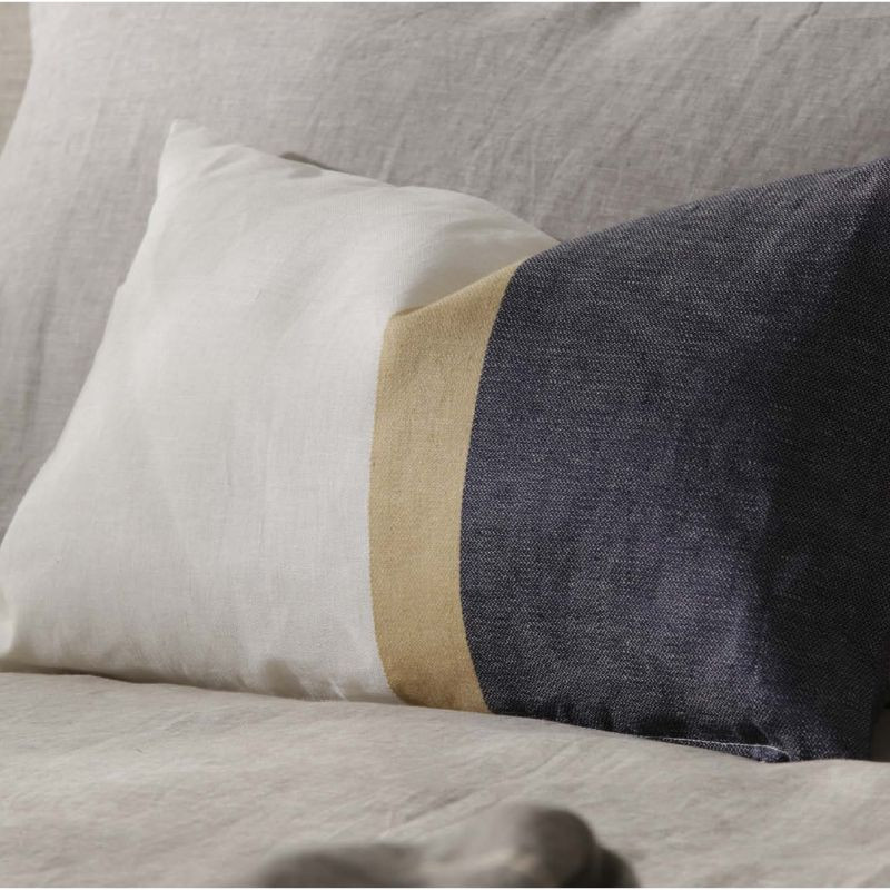 La funda de cojín James Bassols está confeccionada en un tejido 100% lino con hilo teñido en color natural con una franja amarilla en el centro y un lateral en marino. La funda de cojín cuenta con un cierre fácil de cremallera y tiene una medida de 30x50 cm. La funda de cojín Bassols es perfecta para combinar con el resto de ropa de cama de Bassols. La fabricación de esta funda de cojín se hace en España.