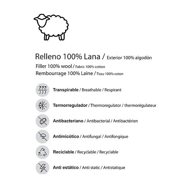 Este relleno nórdico de lana 100% cuenta con un gramaje de 120 gr. Tiene un poder térmico bajo y está confeccionado a medida en tejido exterior de 100% algodón con acabado suave. Su núcleo de lana está perfectamente repartido y el cosido favorece que éste no se mueva y se distribuya perfectamente a lo largo de todo el nórdico. Este relleno nórdico es transpirable y termoregulador, además cuenta con propiedades antibacterianas y antimicóticas.