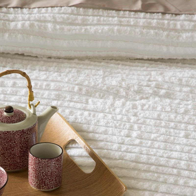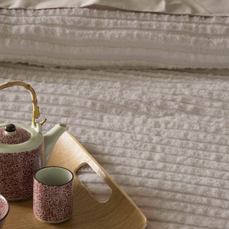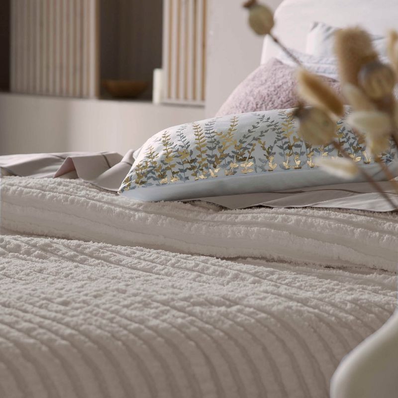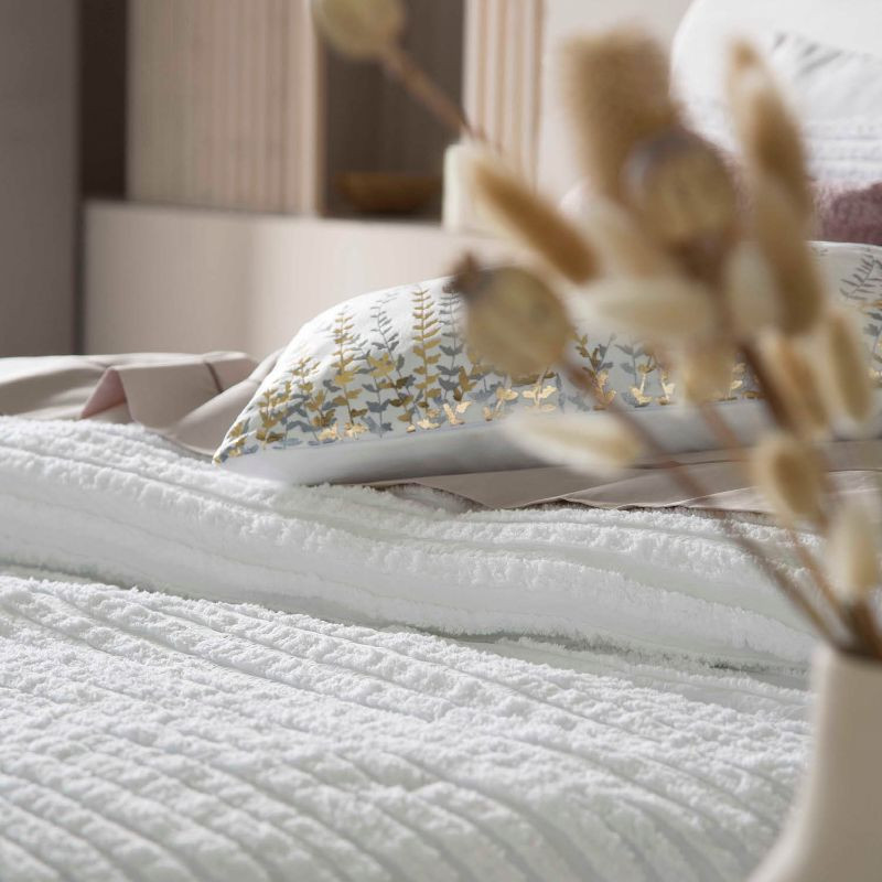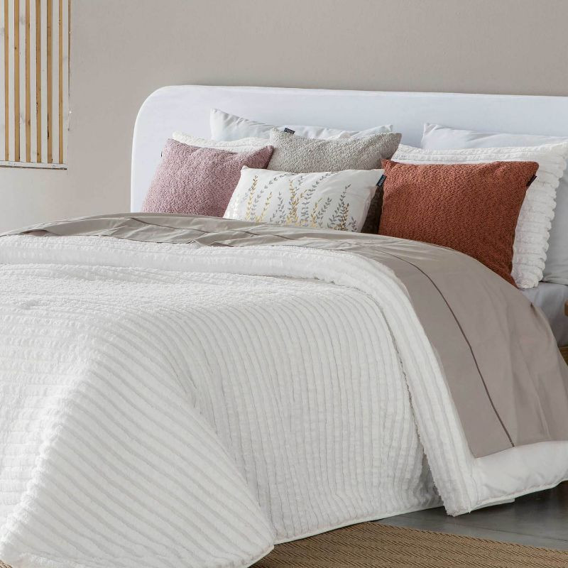 Colcha bouti Mery de la marca Antilo. Preciosa colcha Mery con estampado en líneas con relieve y textura. Disponible en color beige y blanco. Además, puedes encontrar la colcha Antilo en varias medidas de talla. La colcha Mery es una colcha bouti de largo especial ya que su medida de largo llega hasta los 270cm, pudiendo así vestir tanto camas de 190/200cm o camas de 210/220cm.