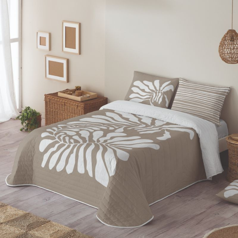 La colcha bouti Yare Naturals confeccionada con repuntes horizontales para asegurar la mayor suavidad y que las fibras del relleno se mantengan en el sitio. La colcha Yare tiene un relleno fino de 70g ideal para los meses de entretiempo u hogares muy bien aclimatados en la época de frío. El diseño de la colcha está estampado con una hoja gigante blanca que cubre toda la colcha, el color de la prenda es beige.