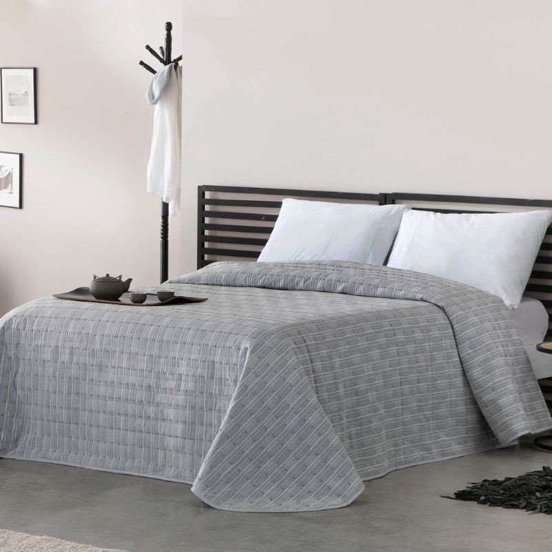 La colcha jacquard Aina Naturals diseñada en un tejido de jacquard disponible en color gris o en color beige y para diferentes tamaños de cama. No incluye cojines. El diseño de la colcha es muy atemporal a la vez que sutil con unas rayas en diferentes colores cosidas sobre el tejido. Un toque elegante y moderno para tu dormitorio. ¡Combínala con el plaid que más te guste!