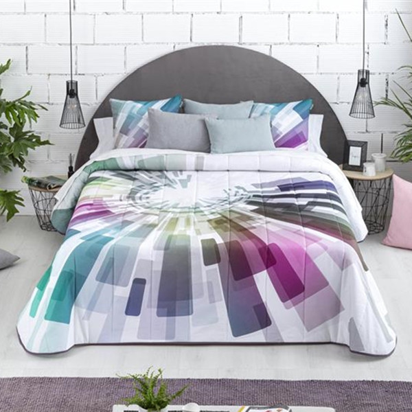 Este conforter tiene un diseño colorido y moderno con detalles geométricos en colores malva, azulados y neutros. Es perfecto para vestir tu dormitorio con un toque moderno y vibrante.