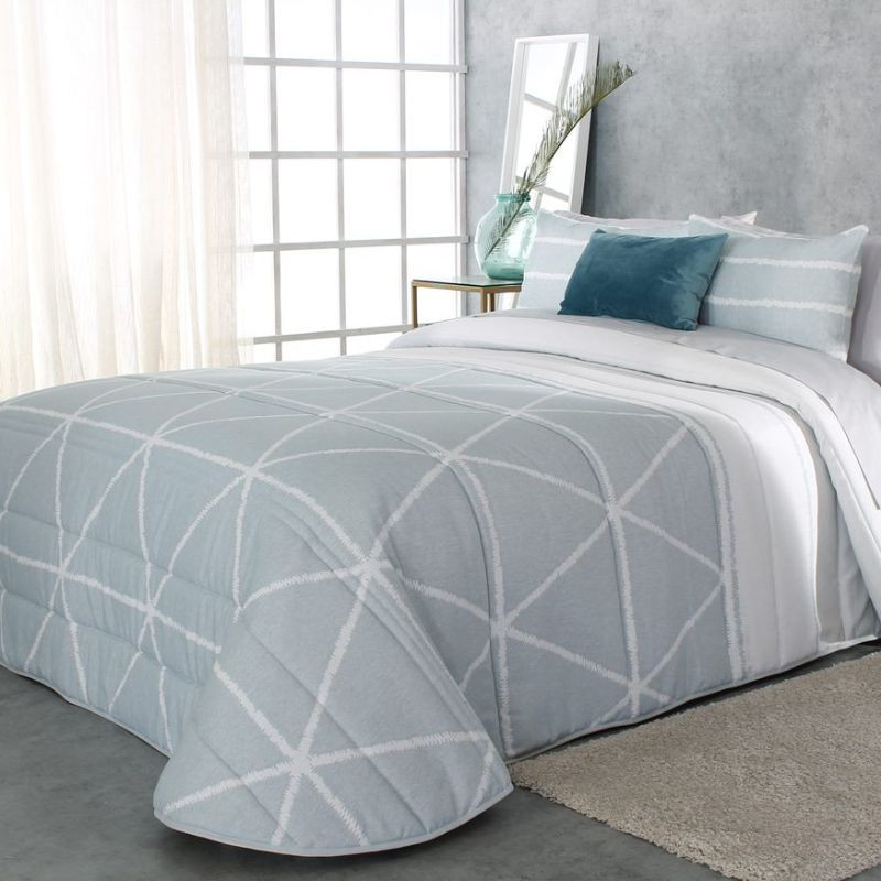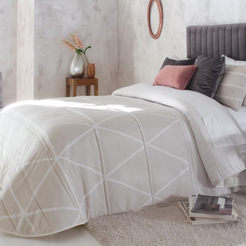 Edredón acolchado Tyson Reig Marti es ideal para todos los dormitorios con cama de matrimonio ya que solamente está confeccionado en estas tallas. Este edredón cuenta con un estampado elegante y moderno en tejido jacquard con estampado de líneas que hacen formas geométricas. Los colores disponibles son beige y azul, y se incluyen dos cojines a juego con la prenda. Además, puedes combinar con un plaid.