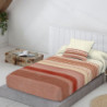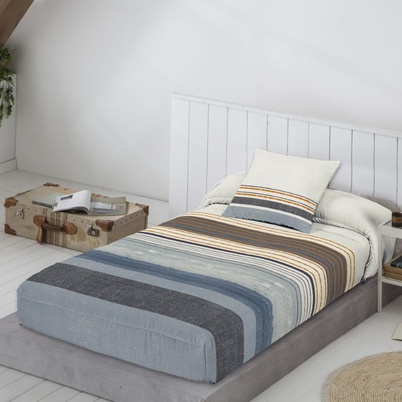 Edredón ajustable Jónico de la marca tejidos JVR estampado diseño juvenil y moderno de rayas en diferentes colores y disponible en color teja o azul. Confeccionado en España para todas las medidas de cama estándar. El edredón nórdico JVR tiene un acolchado de 250gr ideal para los meses de frío. ¡Combínalo con una manta o plaid!