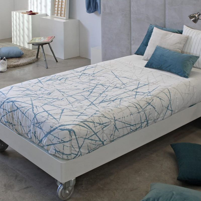 Edredón ajustable Puy Reig Marti con gomas ajustables para las camas individuales. Es ideal para que no se mueva el edredón y para que no se destape la persona que está durmiendo. Este edredón solamente está disponible para cama individual y cuenta con un estampado abstracto de rayas y garabatos en color azul o color gris ideal para combinar con resto de decoración de tu dormitorio.