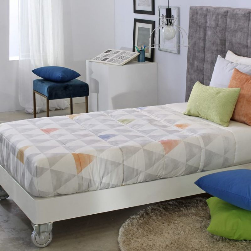 Edredón ajustable Romney Reig Marti con gomas ajustables para las camas individuales. Es ideal para que no se mueva el edredón y para que no se destape la persona que está durmiendo. Este edredón solamente está disponible para dos medidas de cama y tienes la opción de comprarlo con un estampado de triángulos en tonos grises y coloridos que forman una paleta ideal para combinar con el resto del dormitorio.