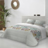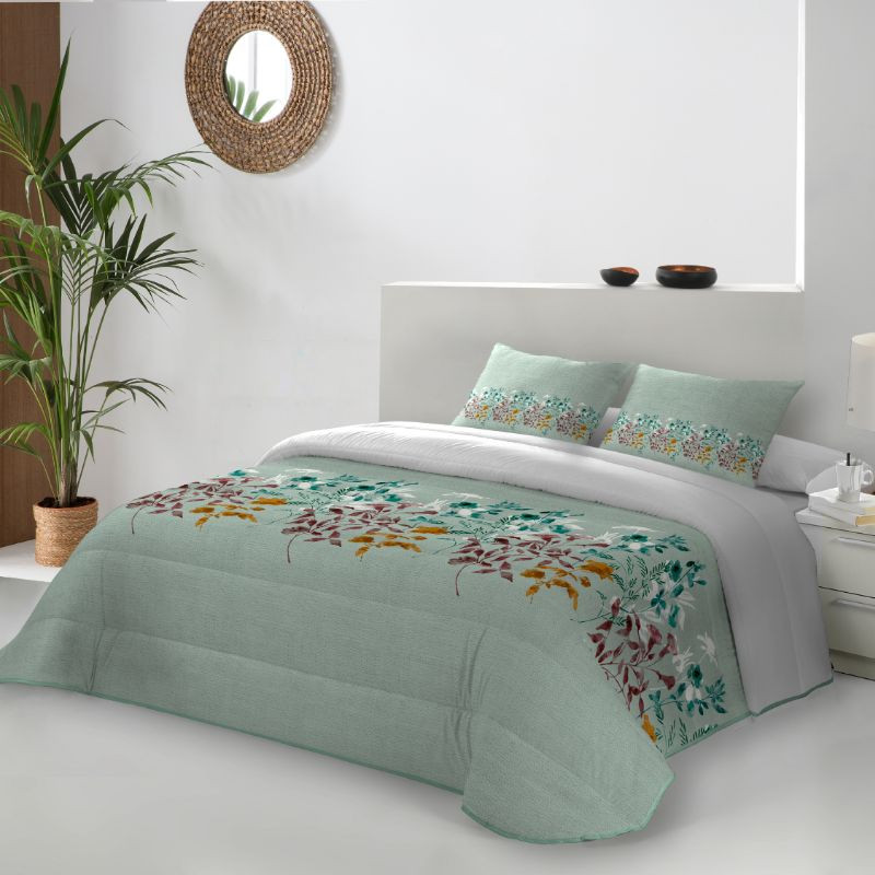 Edredón comforter Cala de la marca tejidos JVR estampada con diseño elegante de flores en el centro de la prenda y disponible en color turquesa o gris. Confeccionado en España para todas las medidas de cama estándar.