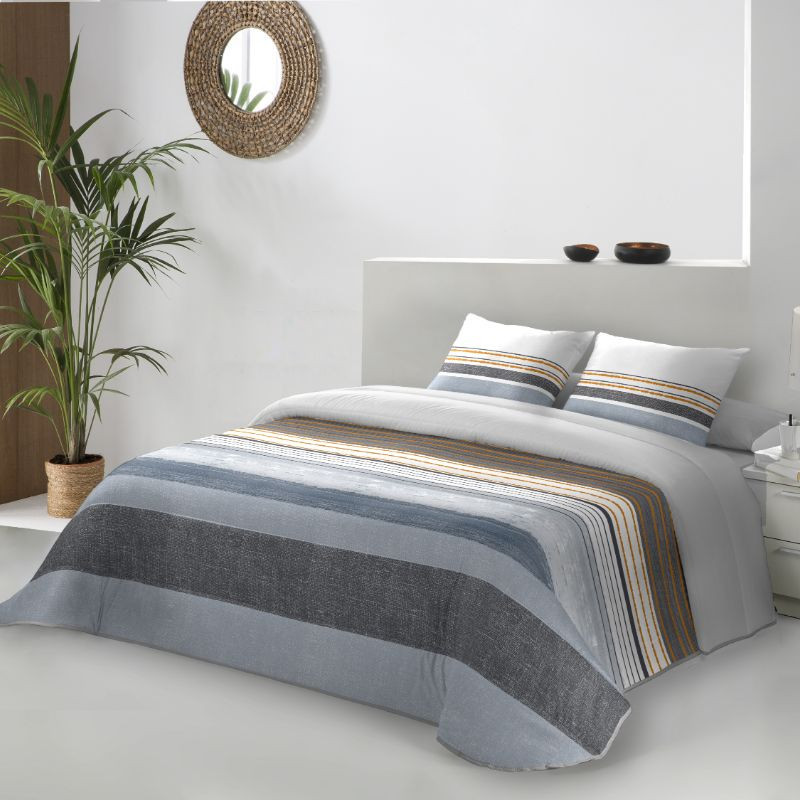 Edredón comforter Jónico de la marca tejidos JVR estampado diseño juvenil y moderno de rayas en diferentes colores y disponible en color teja o azul. Confeccionado en España para todas las medidas de cama estándar. El edredón nórdico JVR tiene un acolchado de 400gr ideal para los meses de frío. ¡Combínalo con una manta o plaid!