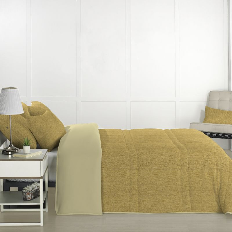 Edredón comforter Sandde la marca tejidos JVR con diseño de tejido jaspeado en color liso, disponible para varios tamaños de cama estándar y en color beige, turquesa u oro. Confeccionado en España para todas las medidas de cama estándar.