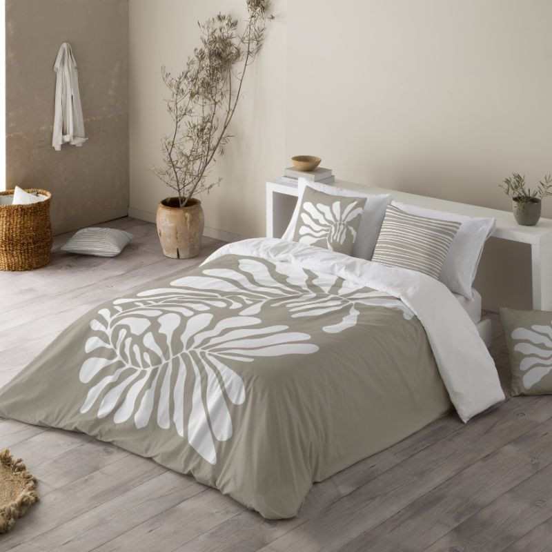 Todas las fundas nórdicas de Naturals cuentan con un cierre de solapa de unso 45 cm que podrás remeter hacia el interior o sujetarlo en el somier y el colchón. En el caso de la funda nórdica Yare moderno diseño con una hoja gigante blanca que cubre toda la colcha, el color de la prenda es beige.
