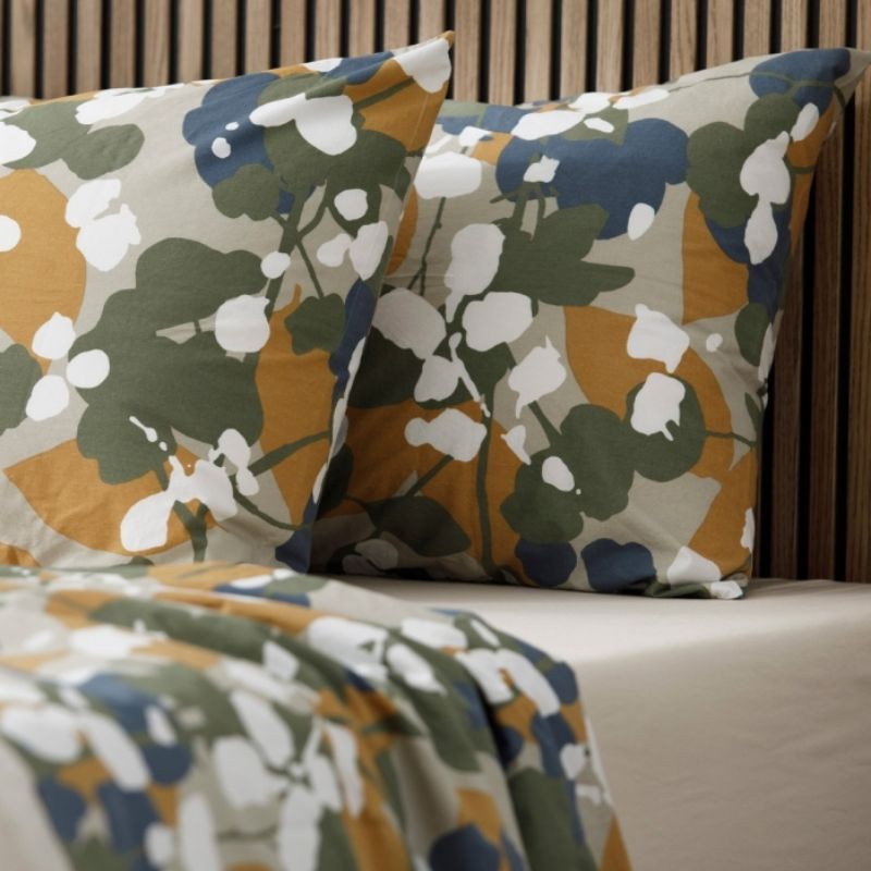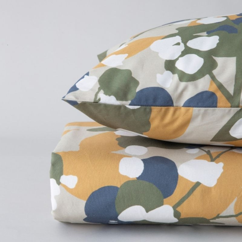 En el juego de sábanas Irina incluye una sábana encimera y una funda de almohada a juego. El juego de sábanas está confeccionada con un tejido 100% algodón peinado de fibra larga de percal 200 hilos. Cuenta con un estampado floral abstracto en diferentes colores otoñales. Este juego de sábanas de algodón está fabricado en España.